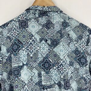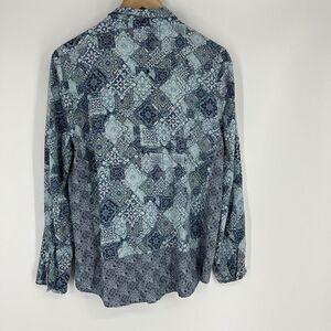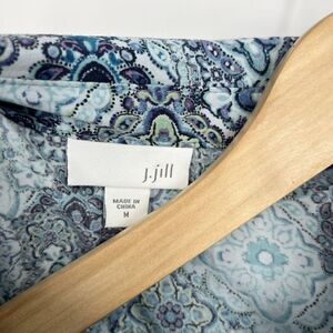 J Jill Top Size Medium Womens Blue Batik Print Blouse Popover Border Trim Rayon