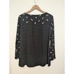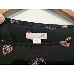 J Jill blouse in a comfy knit fabric has long sleeves and a paisley pattern. Black fabric. Back is pieced on in a contrasting fabric / smaller pattern and is slightly longer .