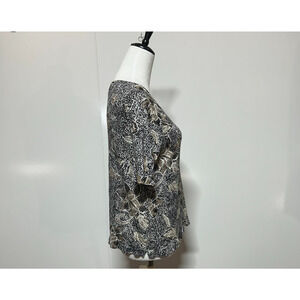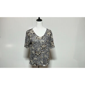 J Jill Top Womens Medium Black Tan Floral 100% Linen Short Sleeve Scoop Neck