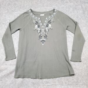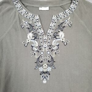 J. Jill Top Womens Medium Embroidered Paisley Waffle Knit Notched V-Neck Gray