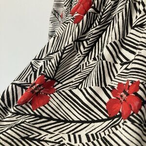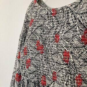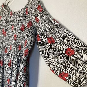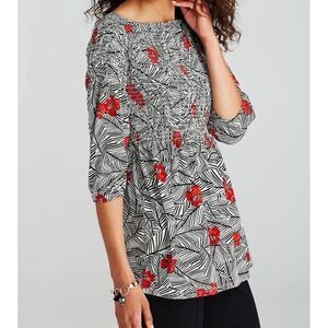 J Jill Top Womens Medium Smocked Tropical Palm Hibiscus Floral Black White Red