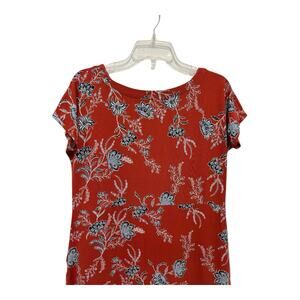 The J. Jill Wearever Collection Dress is a knee-length shift dress made of spandex and rayon fabric. It features a round neckline, cap sleeves, and a pullover closure. The dress is designed with a red, blue, and white floral pattern, making it suitable for various occasions such as travel, Holy Communion, casual, and business events.