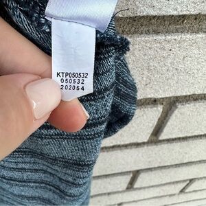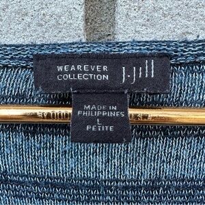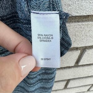 Denim blues in a variegated stripe. Boat neck. Side slits at hem. Rayon/lycra. Size L Petite. Excellent used condition.