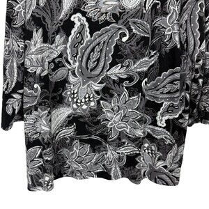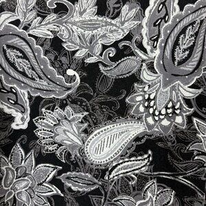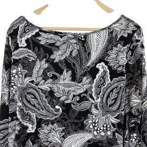 Paisley floral print top featuring a black and gray color scheme. Stretchy material ensures comfort. Ideal for casual or office wear.