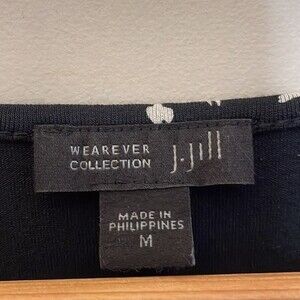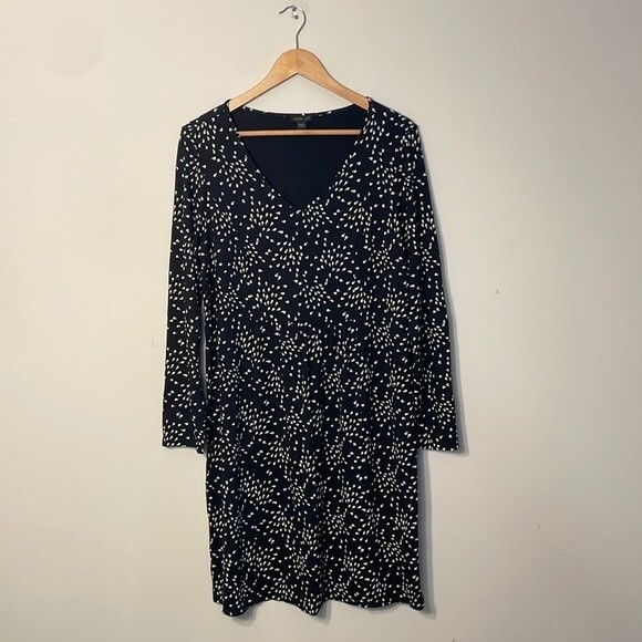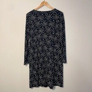 Approximately knee/mid-calf length. Black background with white leaf/petal pattern. Stretchy fabric; looser fitting dress.