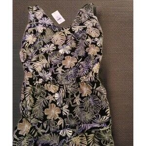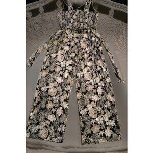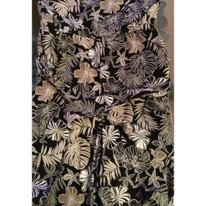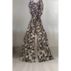 This J. Jill Wearever Collection jumpsuit in size 1X features a floral pattern with a sleeveless design and V-neckline. It has a tie closure, wide-leg flare style, and is made of a lightweight, breathable blend of spandex and rayon. The jumpsuit includes pockets and is accented with a bow, making it a versatile and comfortable piece for casual occasions. Perfect for those who appreciate a hipster, nature-inspired, or bohemian style, this jumpsuit is a modern and chic addition to any wardrobe.