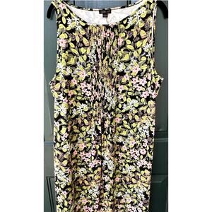 Dress has a pretty pink and green floral print on a black background, and sweet little pintucks to elevate it above the same-old knit tank dress. Exactly the quality and attention to detail we expect from J. Jill!