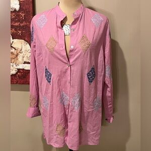 Our lightweight cotton tunic with multicolored embroidery is a soft and easy style that brightens up your spring wardrobe. Plus, it's versatile enough to wear it your way. High side vents allow you to tie it in the front for a fresh twist over tops and tees. Or you can wear it buttoned up for a more classic look. Band collar.