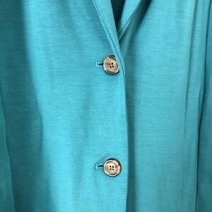 J. Jill Wearever Collection teal blue cardigan blazer with a two-button closure and pockets. Relaxed fit blazer jacket with side pockets suitable for career, classic, casual, modern, workwear, business casual, professional, and coastal styles.