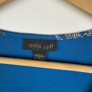 Keywords: J. Jill dress, floral print dress, knit dress, blue dress, short sleeve dress, casual dress, women's dress, size S, rayon dress, comfortable dress, spring dress, summer dress, everyday dress, floral pattern, scoop neck dress