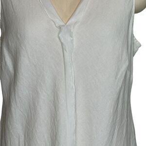 Perfect summery lined white linen a-line midi dress. Raw hem ruffle design down the front. Sleeveless, V neck
