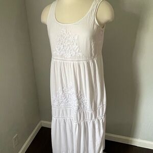 Embrace effortless style with this J. Jill white maxi sundress, featuring a tiered and smocked design. The sleeveless dress boasts a scoop neckline and a flowy silhouette, perfect for casual or resort wear. Its lightweight fabric and elegant tiers make it an ideal choice for warm weather occasions.