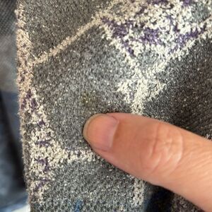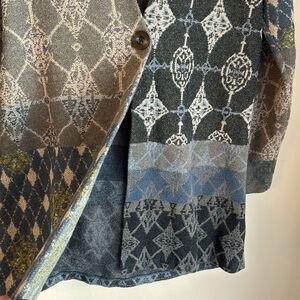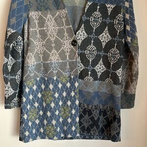Unique artsy and fun! This beautiful and comfortable sweater is a statement piece! Fun patterns throughout. There is one very small mark on sleeve near thumb - please review all photos! Still a lot of life left. This sweater runs slightly big and would also fit a medium.