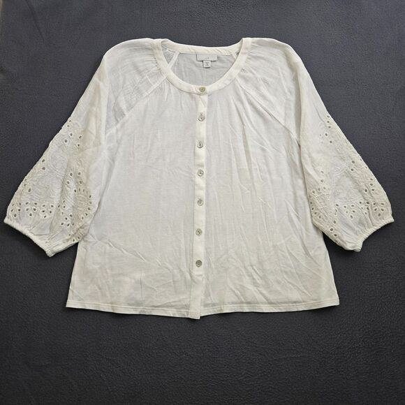 J. Jill Women XS White Button Front 3/4 Eyelet Lace Sleeve Peasant Top