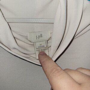 This J. Jill silk turtleneck top offers a sophisticated look with its elegant drape and luxurious fabric. The clean design and neutral color make it a versatile addition to any wardrobe. Ideal for a polished appearance, this top is suitable for both casual and professional settings.