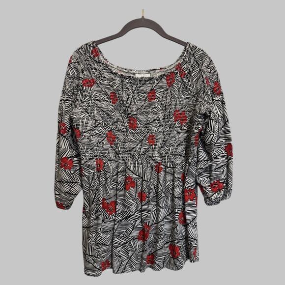 J. Jill Women’s Babydoll Boho Smocked 3/4 Sleeve Stretchy Black Red White Size M