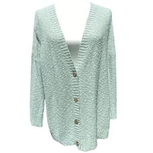 A loose knit v-neck cardigan with front button closure.
