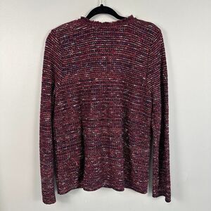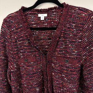 Classic and cozy, this J. Jill tweed cardigan sweater features a rich burgundy color and a timeless knit texture. Perfect for layering over work or casual outfits, it offers warmth and style .