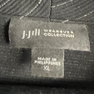 J. Jill Wearever Collection long sleeve cowl neck sweatshirt. This sophisticated piece features elegant black fabric accented with metallic silver stripes, offering a touch of glamour to a relaxed style. The cowl neck design adds a cozy yet refined element, making it perfect for versatile wear. Crafted with quality and comfort in mind, this sweatshirt is a must-have addition to your collection.