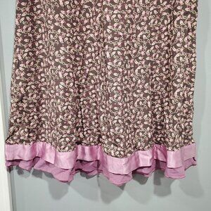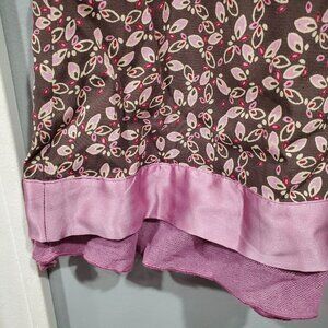 J. Jill Women's Floral A-Line Purple Satin Trimmed Skirt Ruffles Zip Size 8. Please note a small spot on the front ruffle area, see pictures. I am hopeful this will be removed when dry-cleaned. The dress color appears more brownish in the pictures, but in person it is more of a tanish green/gray. Closure is a left side zip. All measurements are approximate.