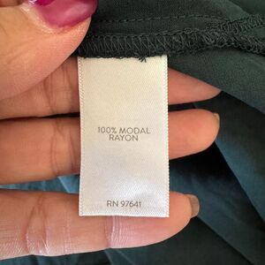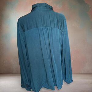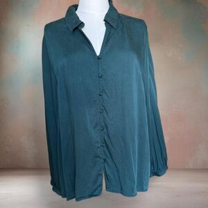 hunter green, modal rayon, collared blouse, button-up shirt, long sleeve, relaxed fit, fabric buttons, office wear, casual chic, sophisticated style