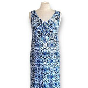 J Jill Womens Maxi Dress XS Blue White Tile Print Stretch Jersey Sundress Resort