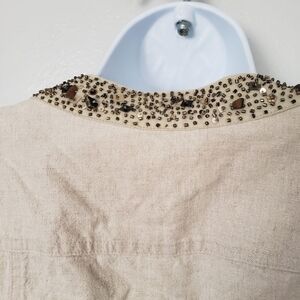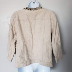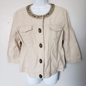 J. Jill Women's Medium Beige Blazer Jacket Quarter Sleeve Brown Beaded Linen Top
