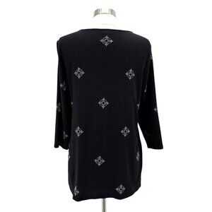J. Jill Womens Medium Tunic Top Embroidered Black Gray Boho V-Neck. Pullover V-neck 3/4 length sleeve black tunic top shirt. Gray embroidered boho pattern. Cotton & Tencel blend. Embroidery is Polyester. Made in India.