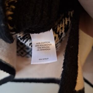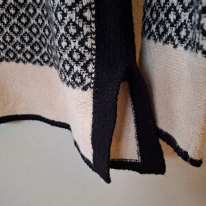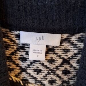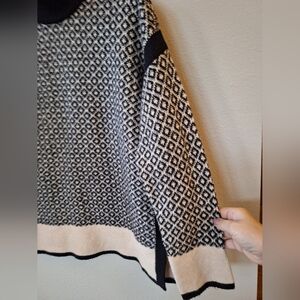 J. Jill Womens Knit Sweater. Mock neck. Side split hem. Long hem. Black and cream with geometric pattern. Relaxed fit. Soft. Size S Pit to pit flat lay 22" length from collar to hem 29" measurements are approximate