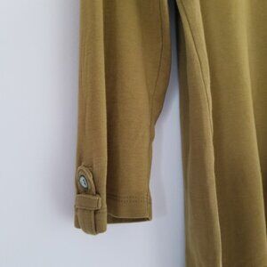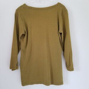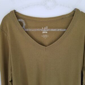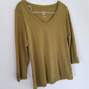 J. Jill Women's Perfect Pima 100% Cotton V Neck Casual Top Blouse Shirt Minimalist. Top is an Olive Green color and has 3/4 Sleeve with decorative button on sleeve.
