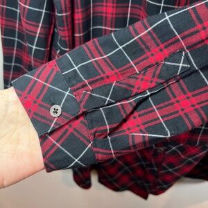 J. Jill Plaid Button Up Tunic Shirt Red Black White Tartan V-Neck Spread Collar Long Sleeve with Button Cuff Front Left Chest Pocket Rounded Hem with Side Slits Lightweight Fall Layering Preppy