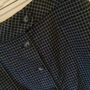 * Style: contemporary, pocketed skirt, work attire, casual, dark navy blue, dark gray, gingham style, stylish, career, business casual, button front