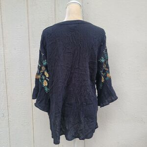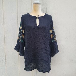 J Jill Women's Top L Black Embroidered Floral Tassel Tie 3/4 Sleeve Blouse Boho