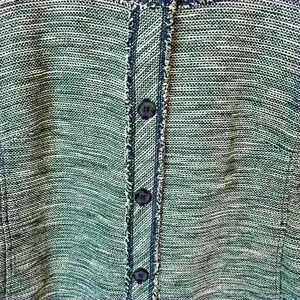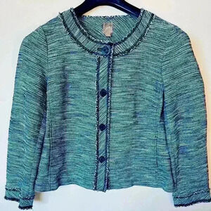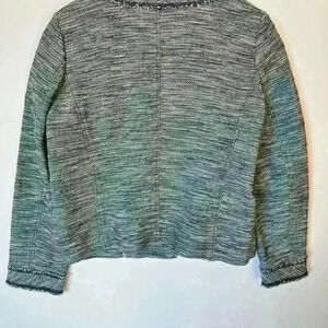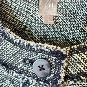 J. Jill Women's Tweed Fringe Button Front Jacket Pockets in a size M. Has a Round Neck, Long Sleeve, Side Pockets and button closure.