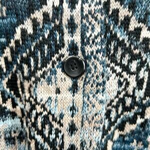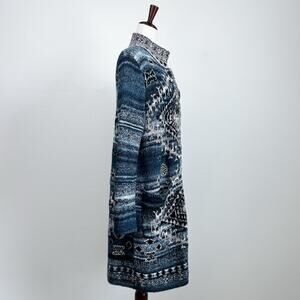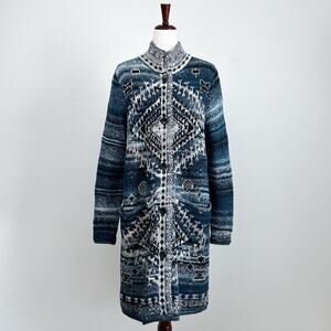 Size Medium J. Jill long cardigan. Blue tribal fair isle knit design. Button-up front, Two pockets. Great condition! Pit to pit 20". 37" long, from shoulder to hem. Save 15% on your order by bundling 2 or more items together! Quick Shipping! Boho, bohemian, winter, autumn, fall, Navajo, western, southwestern, tribal, sweater