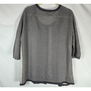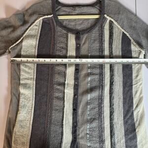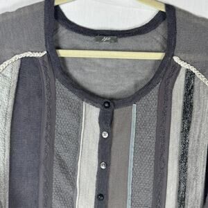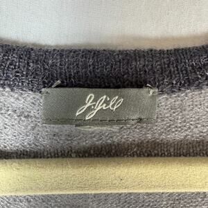 The J. Jill Wool Mohair Button Up Cardigan is a versatile and stylish top for women. This gray cardigan features a striped pattern, scoop neckline, and 3/4 sleeves with raglan sleeves. Made from a blend of nylon, mohair, wool, and acrylic, this knit sweater is perfect for travel, casual outings, or business meetings. With a bohemian and minimalist theme, this cardigan is lightweight and collarless, making it a great choice for the winter, fall, and spring seasons. The button accents add a classic touch to this chic and comfortable top from J. Jill. Pre owned very good condition: Size tags have been removed - measurements included in photos for reference.