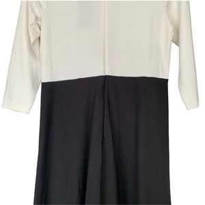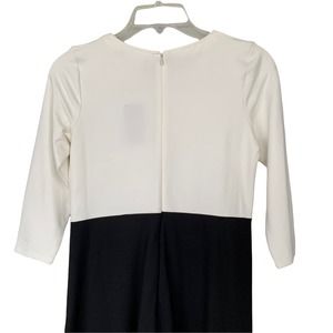 Crew-neck color block dress made from structured ponte knit with added stretch so it's comfortable & holds shape. The contrast of black and white is stunning with the all-around border of embroidered flowers. The subtle fit/flare design waist seam is feminine & flattering. Invisible back zipper, 3/4 sleeves.
