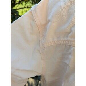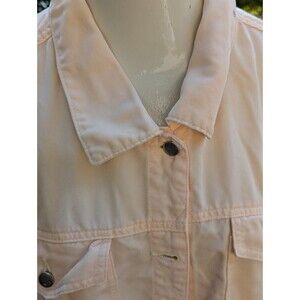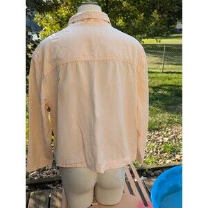From my closet with sadness, this is such a gorgeous wonderful denim styled jacket I will miss from my wardrobe. Easy to wear with everything from shorts, skirts, to a cute dress and lightweight simple sweater. Modern updated styling: dropped shoulder and sleeves and not fitted at the hem which on me, it fell to top of hip. I am 5'3". Metal simple button closure and button placket chest pockets. Cuffs are not buttoned so can be pushed up. Sadly, I have lost weight and it is just too sloppy large on me now. I wore this when I was a size 14-16. The chest measures 24" across between underarms with a length of 22" from shoulder to banded hem. The width of the banded hem is 25" across so it is generously sized.