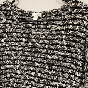 J. Jill black & white sweater, XS 3/4 sleeves, small black stripe in a loose weave between larger stripes of mixed black & white. Great for casual or dressy wear.
