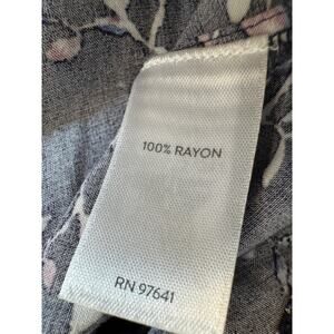 Dusty blue with pink, lavender and cream small floral print. Side zip and elastic waist band.