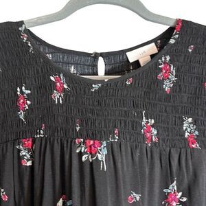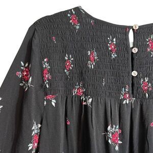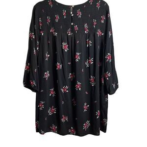 J. Jill smocked yoke rose print on black 3/4 sleeve tunic L