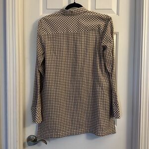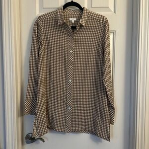 J Jill tan and white button down gingham tunic side vents mother of pearl XS