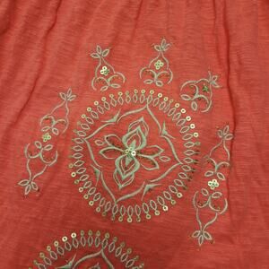 This beautiful J. Jill maxi dress is perfect for any occasion! The tiered design and intricate embroidery give it a unique, boho-chic look. The sleeveless style is perfect for warm weather, and the sequin detailing adds a touch of sparkle. It’s a must-have for your wardrobe! In excellent condition, size large. Cotton blend (My photos made the dress look a little darker but it is more of a orange/pink/coral color).