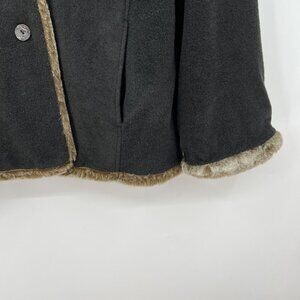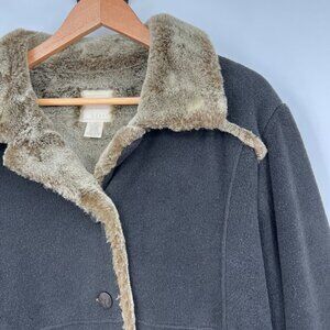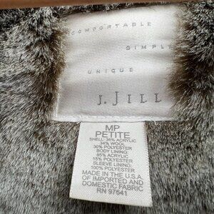 Cozy, stylish J Jill faux fur coat jacket in a sleek charcoal blackish gray color. This wool blend item is perfect for women seeking warmth and fashion in a medium petite size. Button down style adds a classic touch. Pockets