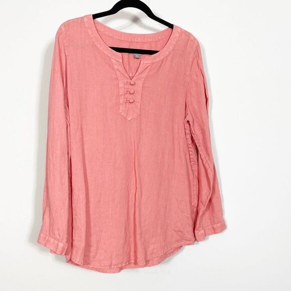 J Jill Linen V-Neck Popover Long Sleeve Tunic Shirt Top In Pink Size M