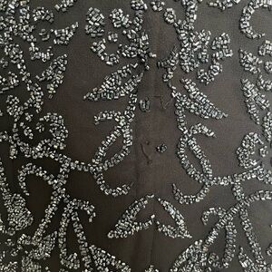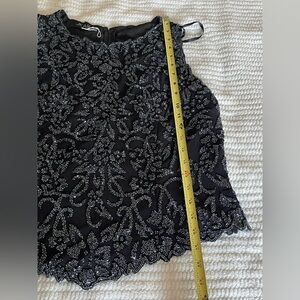 Elegant black sleeveless top featuring intricate silver embroidery. Perfect for special occasions.