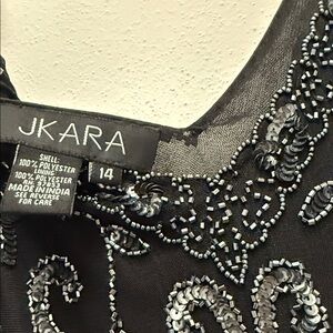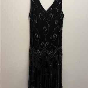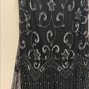 Stunning black midi dress with intricate silver beading. Features a V-neckline and elegant design. Ideal for special occasions.