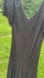 Black midi dress from J Kara is hand beaded with sparkling black bugle beads in an art deco pattern. The dress has two layers, the top layer is a sheer black chiffon with the bead work and the underneath is an opaque solid black. The sheer flutter sleeves are fully beaded and give some modestly to the upper arms. Godet inserts in the skirt are fully beaded as well. Double v neckline is wide across the chest and back. The dress is super flattering on- there is no waistline sewn into it so it drapes over your curves giving a 1920’s flapper/ Gatsy silhouette. Also gives dark fairy core/ glamorous witch/ whimsy goth vibes.
