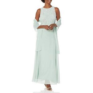 J Kara Women's Sleeveless Scallop Long Beaded Dress W/Scarf Celadon
