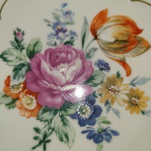 This beautiful piece is a vintage (1934-1949), hand enameled German Porcelain Center Bowl (Graf von Henneberg JLMENAU Torzellan 1777). Hand enameled flowers cover the inside and the gold trim surrounds the rib which is pierced in 4 spots, and detailing on the feet. Bottom stamped green mark, painted underglaze, crown “VEB” over “JLMENAU” over ribbon wrapped shield with bird, flower. Ribbon reads “Graf von Henneberg Porzellon 1777 Made in Germany".